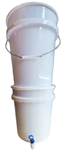 - Water flows through the filter by gravity into the bottom “Clean Water” bucket