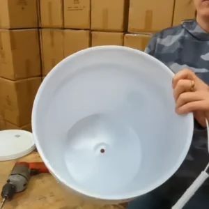 - Use drill motor to make a 1/2 inch hole in the bottom center of the “Dirty Water” TOP bucket