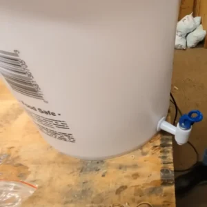 - 1 1/4 inches from the bottom of the “Clean Water) lower bucket’s SIDE, drill a hole sized for the spigot (e.g., 3/4”)
